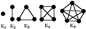 Um grafo Kn possui o número máximo possível de arestas para um dados n. Ele é, também regular-(n-1) pois todos os seus vértices tem grau n-1. | ||
