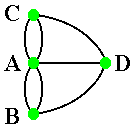 Um grafo G(V,A) é dito ser um multigrafo quando existem múltiplas arestas entre pares de vértices de G. No grafo G8, por exemplo, há duas arestas entre os vértices A e C e entre os vértices A e B, caracterizando-o como um multigrafo. |
